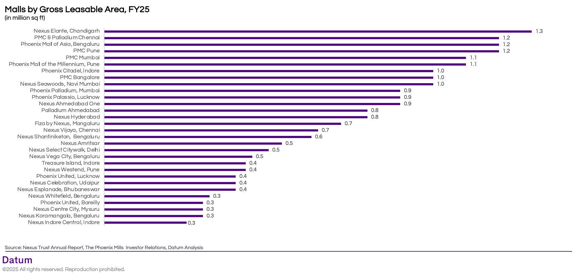 The combined portfolio of Phoenix Mills and Nexus Malls spans a total of 21.4 million sq. ft. across 28 malls in FY25. Within this portfolio, scale is heavily concentrated in mega malls - with 9 properties exceeding 1.0 million sq. ft., together accounting for nearly 48% of total leasable area.