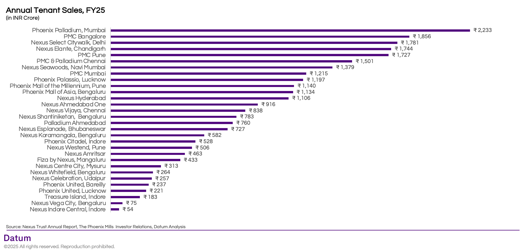 This report leverages detailed data from the portfolios of Phoenix Mills and Nexus Malls - two of India’s largest mall developers - to decode the dynamics of India’s organised retail real estate. Together, these portfolios span over 21.4 million sq. ft. across 28 malls in metros and Tier-2/3 cities, providing a representative lens into how modern retail space is evolving. The study benchmarks malls on scale, tenant sales, footfalls, rentals, growth, and developer share, drawing on disclosures from Phoenix Mills, Nexus Malls, and proprietary Datum analytics.