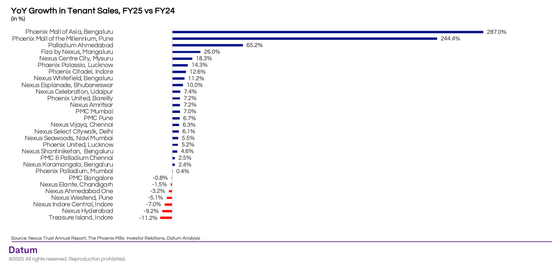 - Phoenix Mall of Asia (Bengaluru, +287%) and Phoenix Mall of the Millennium (Pune, +244%) posted exceptional growth, reflecting their first full year of stabilization after launch.