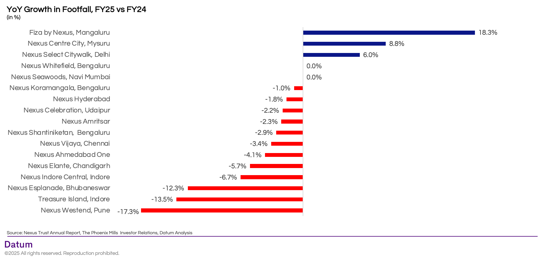 - Palladium Ahmedabad (+65%) and Fiza by Nexus, Mangaluru (+26%) also recorded strong double-digit growth.