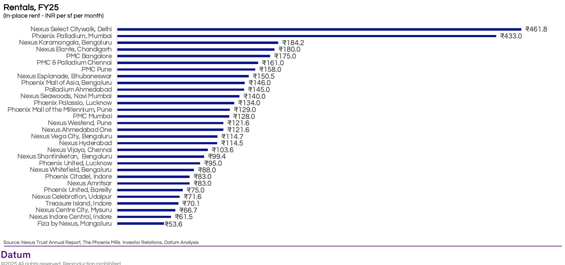 - Regional centers like Nexus Amritsar (₹83), Phoenix United Bareilly (₹75), Nexus Celebration Udaipur (₹72), and Treasure Island Indore (₹70) offer competitive rentals, supporting retailer expansion in smaller but fast-growing catchments.
