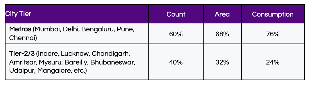 - Metros remain the revenue powerhouses (76% of consumption), ideal for flagship stores, premium positioning, and omnichannel brand presence.