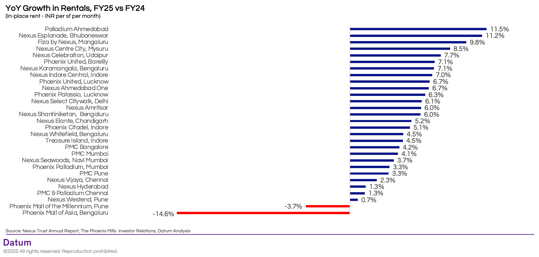 - Mature but resilient assets such as Select Citywalk Delhi (+6.1%), Nexus Koramangala Bengaluru (+7.0%), and PMC Mumbai (+4.1%) reflect stable but moderate rent escalations.