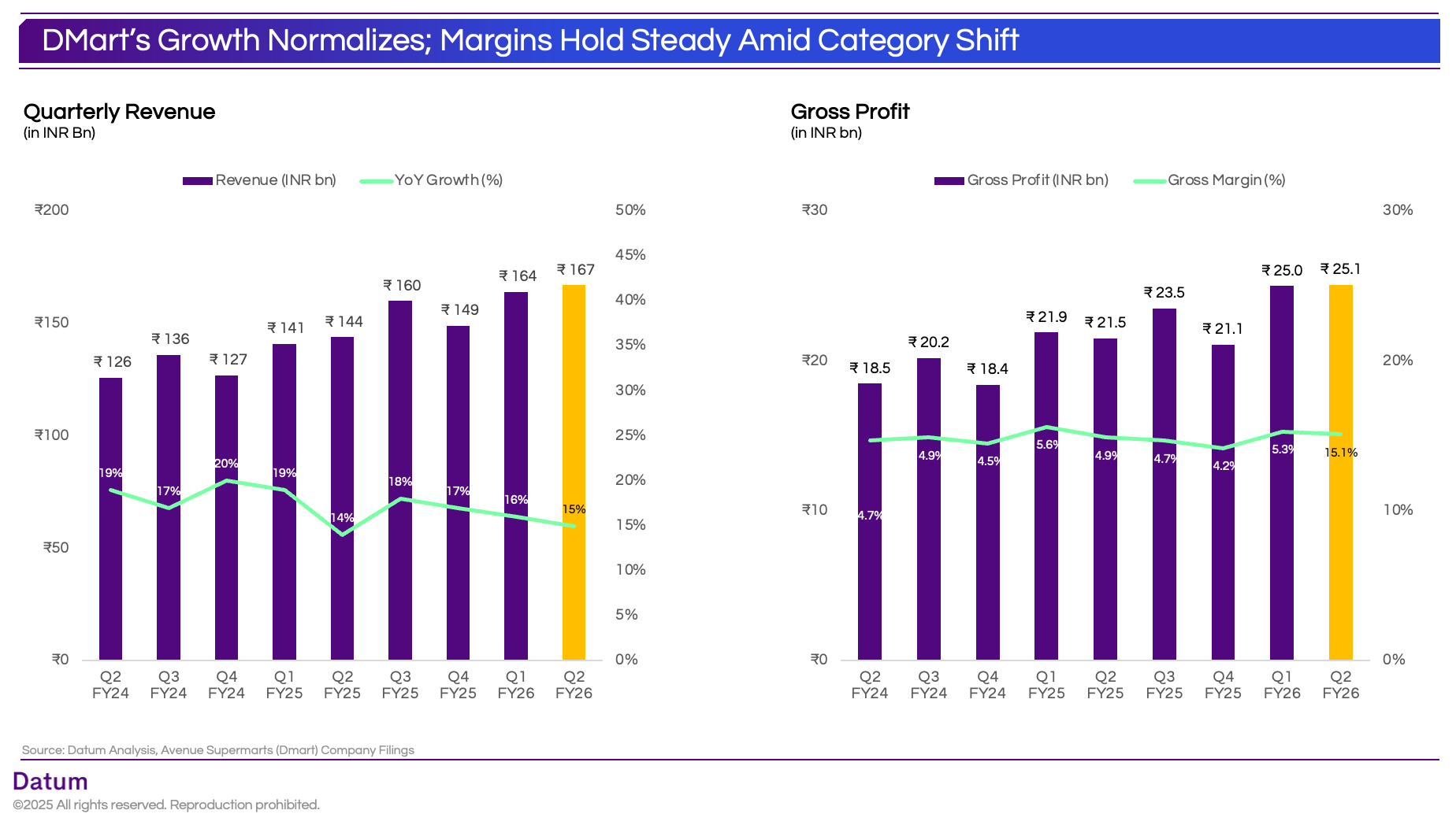 - Revenue growth moderates to 15% YoY. DMart’s topline reached ₹167 billion in Q2 FY26, up from ₹164 billion in Q1, marking a slight sequential uptick but slower YoY growth versus the 18–20% pace in FY25.
