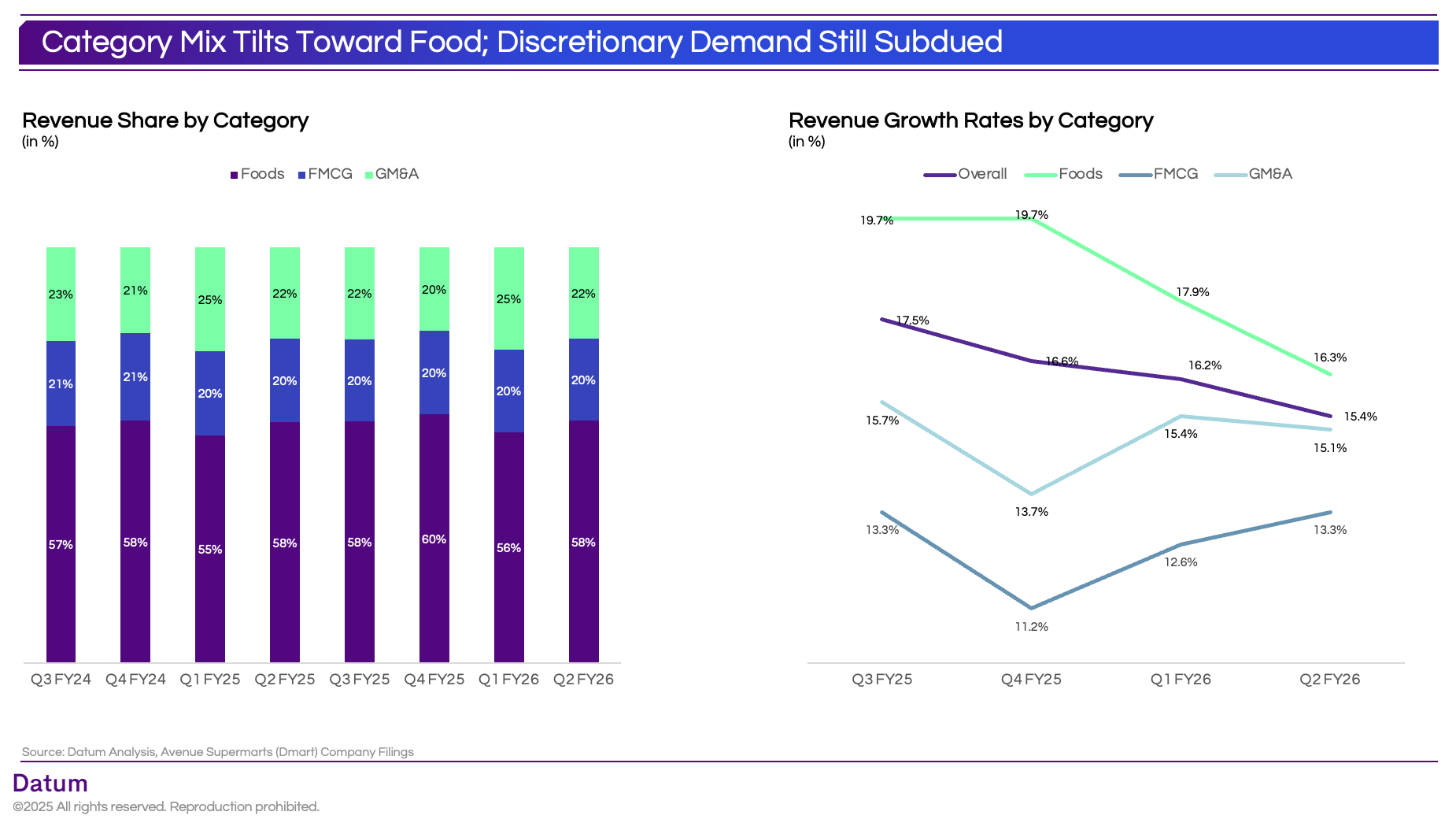 - Food leads the recovery, anchoring 58% of revenue. DMart’s core Food and Staples segment has strengthened its dominance, rising from 55% in Q1 FY25 to 58% in Q2 FY26, underscoring consistent consumer preference for essentials over discretionary categories.