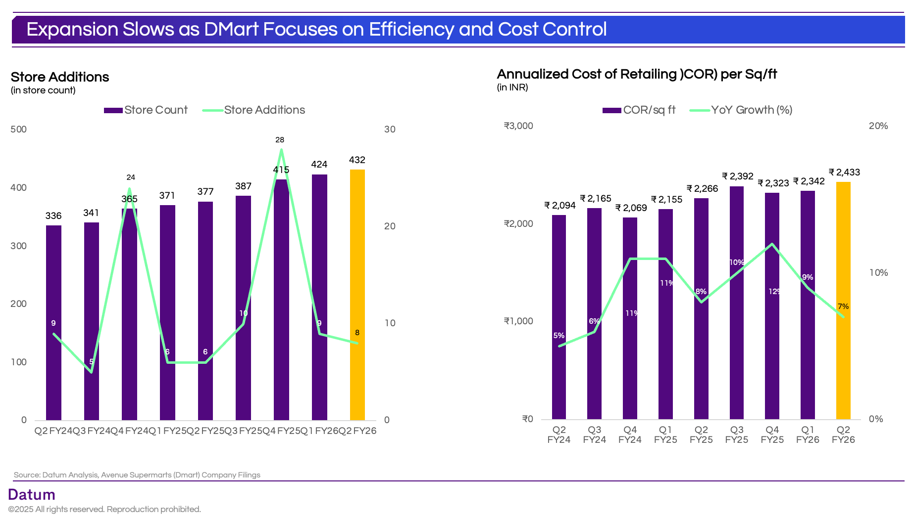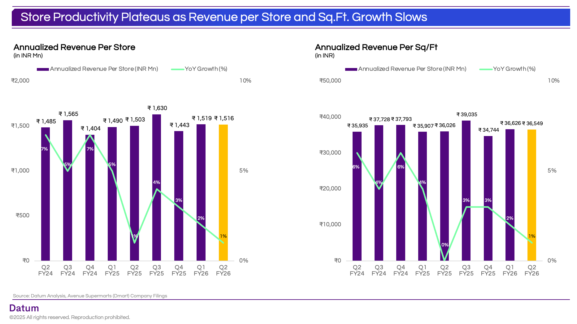 - Shift from scale to productivity. DMart’s recent quarters show a clear transition from scale-led growth to efficiency-led performance, with greater emphasis on store-level profitability and operational discipline.