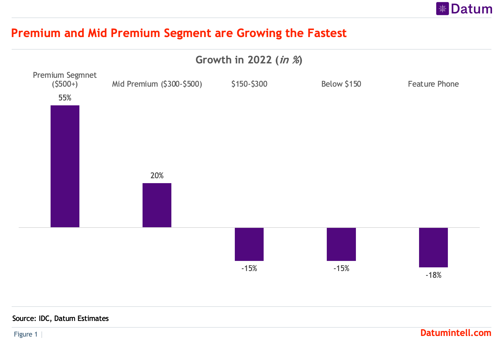 - Feature phones experienced a decline of 18% in 2022, and smartphones priced under $300 experienced a decline of 15% (see Figure 1).