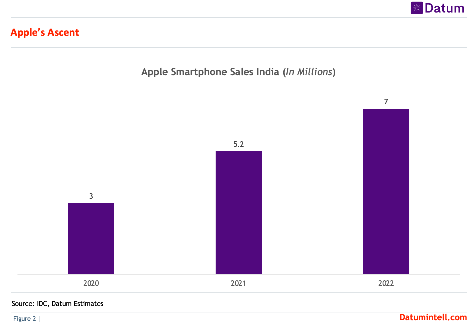 In 2022, Apple sold almost 7 million phones, up from 3 million in 2020 (see Figure 2). In order to increase its regional focus, Apple is expanding its presence in India and making changes to its management structure. In addition to shifting production to India, Apple is working to increase its share of the country's premium smartphone market over the next ten years. After seeing tremendous development in China, Apple understands the value of a large market like China and the necessity of taking the necessary steps to seize the opportunity.
