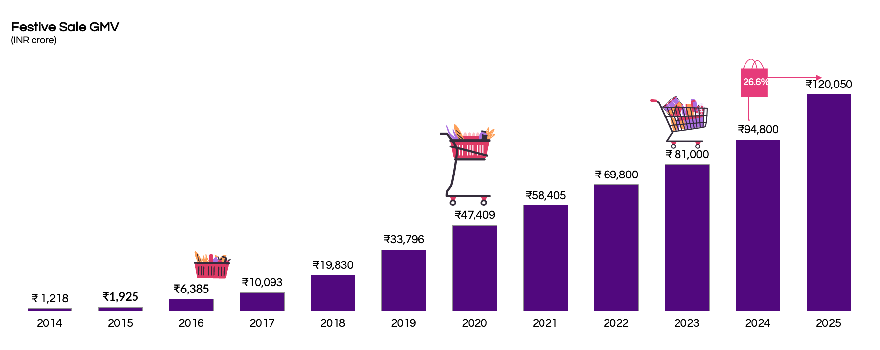 In 2025, festive sales are projected to hit ₹1.2 lakh crore ($13.9 billion), marking a 27% YoY growth over 2024. This reinforces the decade-long momentum in India’s festive e-commerce market, continuing a consistent upward trajectory since 2014.