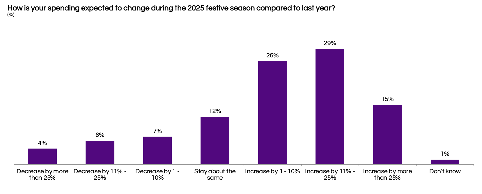 Consumer sentiment ahead of the 2025 festive season points to strong momentum in discretionary spending. Nearly 70% of surveyed shoppers expect to spend more than they did in 2024, with 29% projecting an increase between 11% and 25%, and another 26% anticipating a more modest 1% to 10% rise. Additionally, 15% of consumers are planning a significant spike of over 25% in their festive spending. In contrast, only 17% expect any reduction in expenditure, while 12% intend to keep their spending at similar levels to last year.