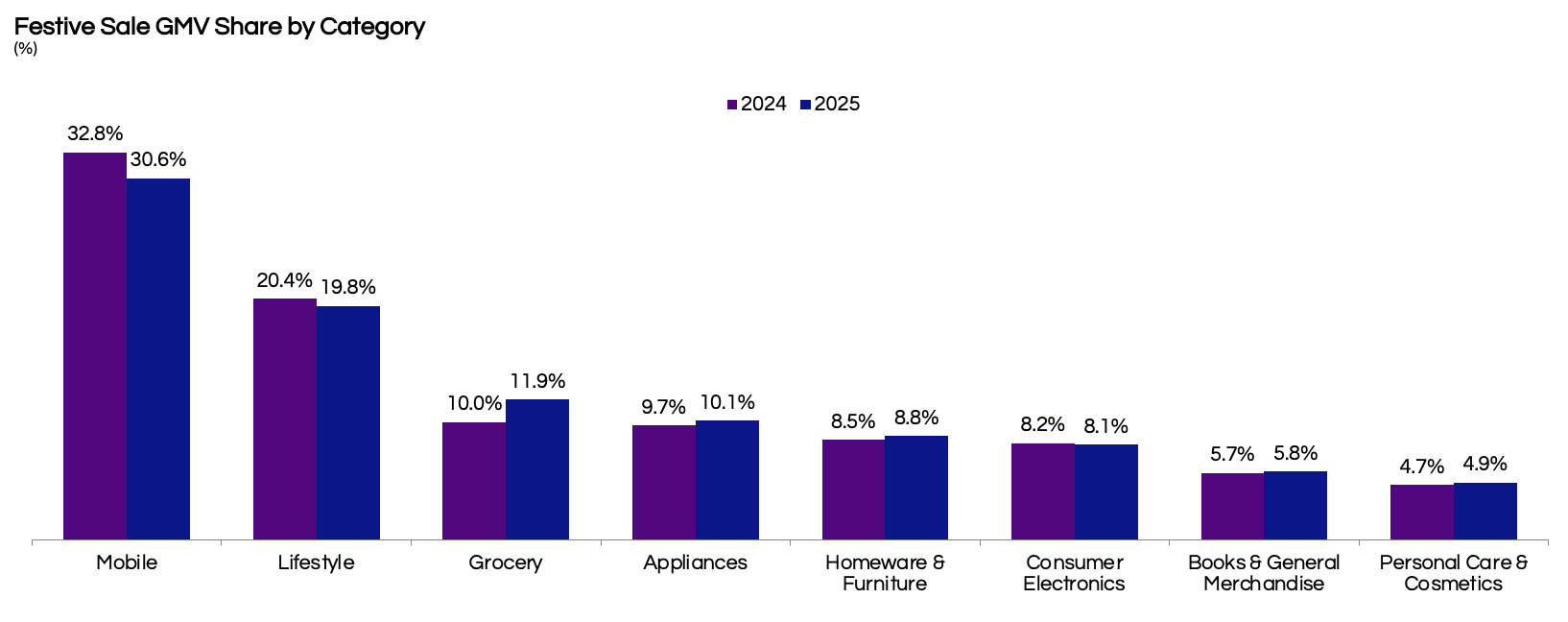 In the 2025 festive season, mobile and lifestyle categories are expected to continue dominating online festive sales, together accounting for just over 50% of the total GMV. However, both have seen a slight dip in their share compared to 2024—mobiles declining from 32.8% to 30.6%, and lifestyle from 20.4% to 19.8%—indicating early signs of market diversification.