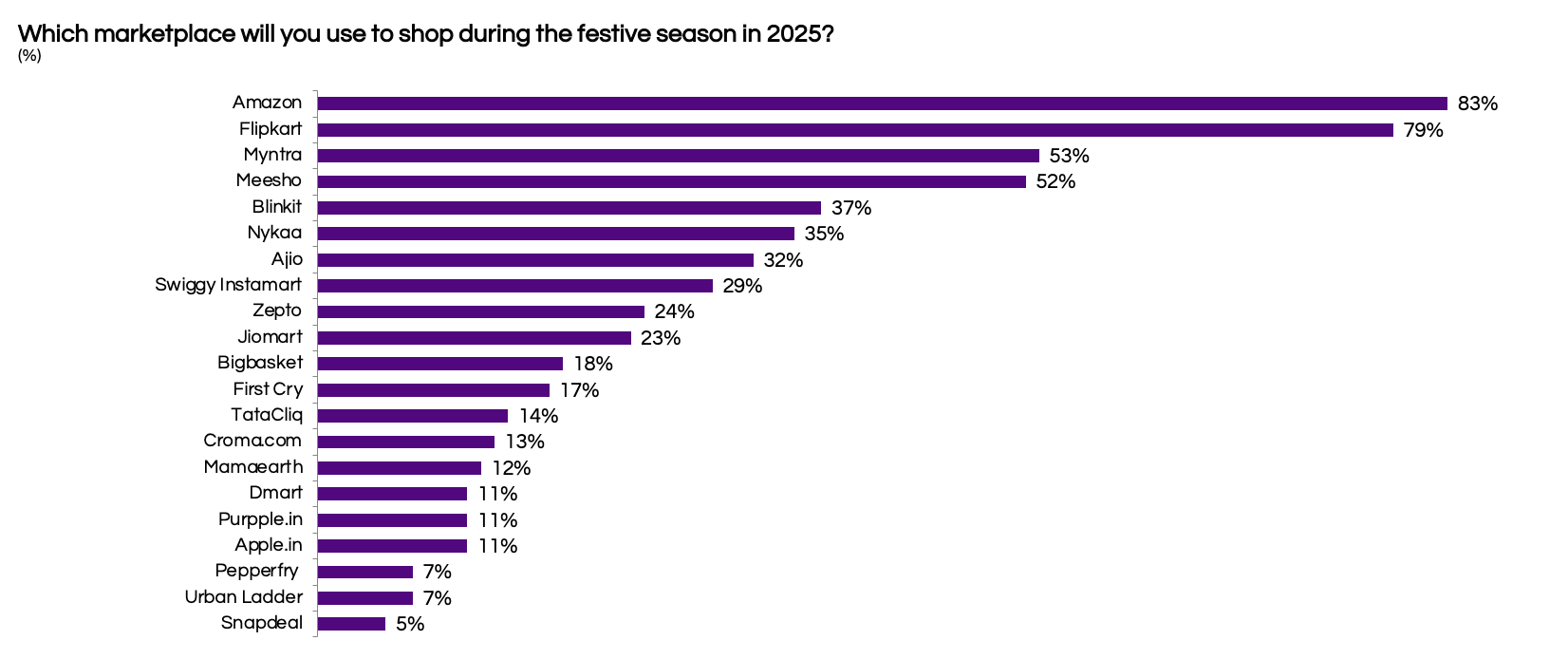 Amazon and Flipkart are set to dominate the 2025 festive season, with 83% and 79% of surveyed shoppers respectively planning to purchase from them. Myntra (53%) and Meesho (52%) are also major destinations, reinforcing their stronghold in fashion and value-conscious segments.
