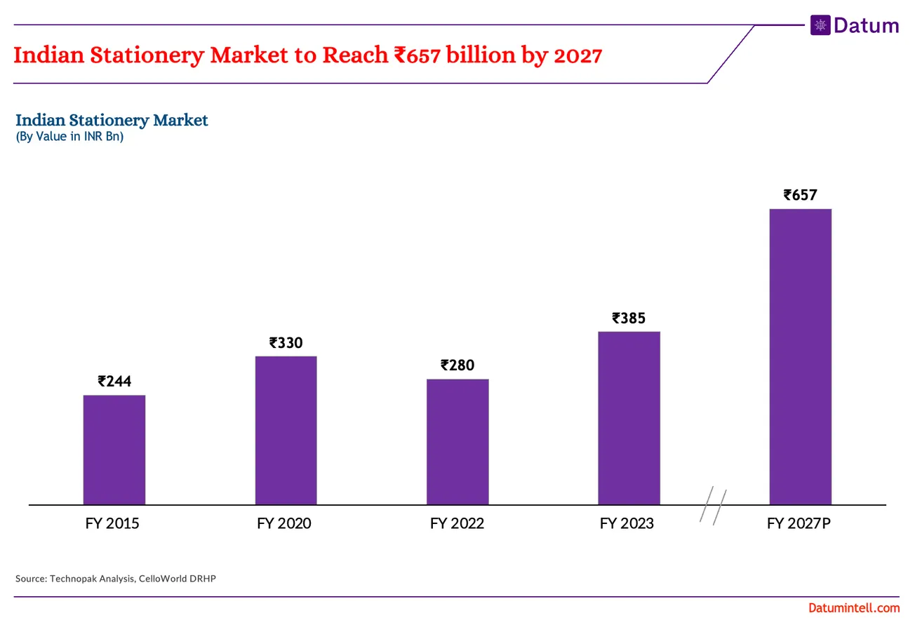 The Indian stationery market has been a beacon of resilience in the face of challenges, showcasing consistent growth over the years. From a market value of INR 244 billion in Fy2015, the market soared to INR 330 billion in FY 2020, registering a commendable CAGR of 6%. However, the onset of the COVID-19 pandemic in FY 2021 brought a temporary halt to this growth trajectory as schools, colleges, and offices shifted to online modes of operation, leading to a substantial sales dip.