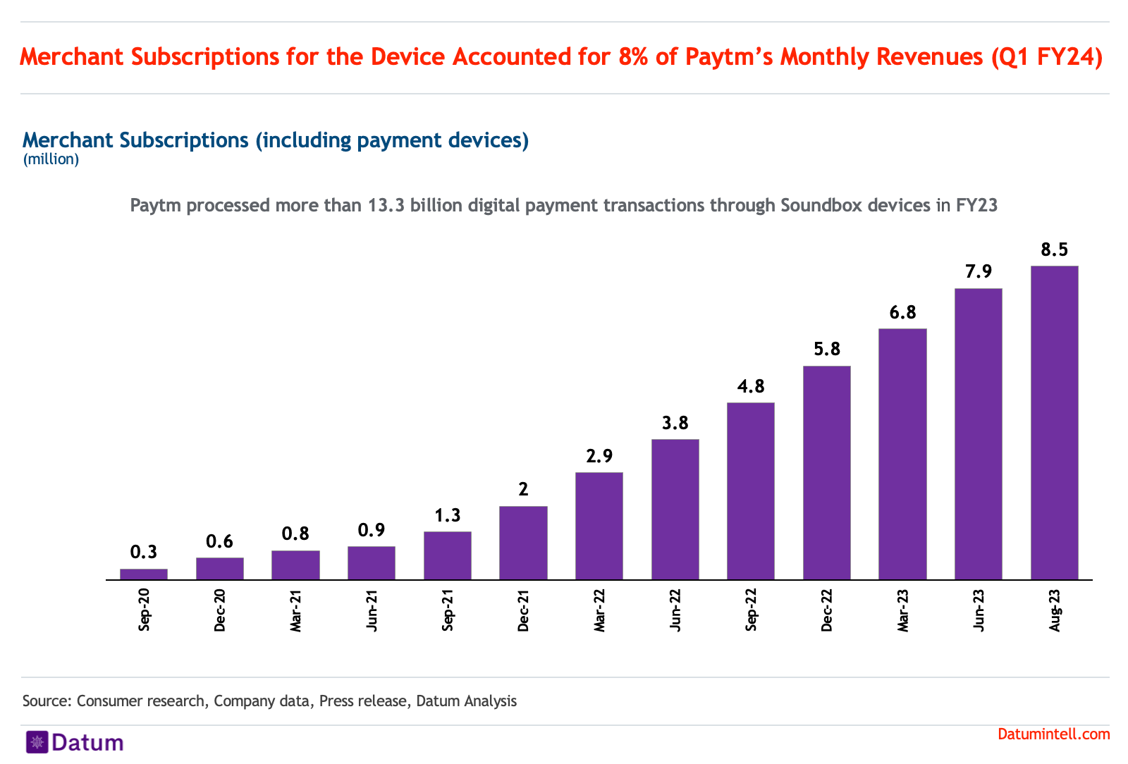 After the launch of the first payment sound box in 2020, Paytm deployed 8.5 million devices till August 2023. According to Paytm’s annual report, these devices processed 5 billion digital payment transactions in FY22 for Paytm and 13.3 billion transactions in FY23. This really highlights the impact that the Soundbox has had on the Indian payments landscape. Apart from driving the payment transactions the monthly subscription fees also adds to the topline of payment companies with Paytm’s Sound boxes accounting for 8% of Paytm’s Monthly revenue in Q1 FY24. The Soundbox alone has added Rs 600 crore to Paytm’s topline, and has emerged as a key merchant retention tool. In conclusion, the Soundbox contributes to increasing transactions, merchant retention, and additional revenue, making these markets very competitive in the months to come.