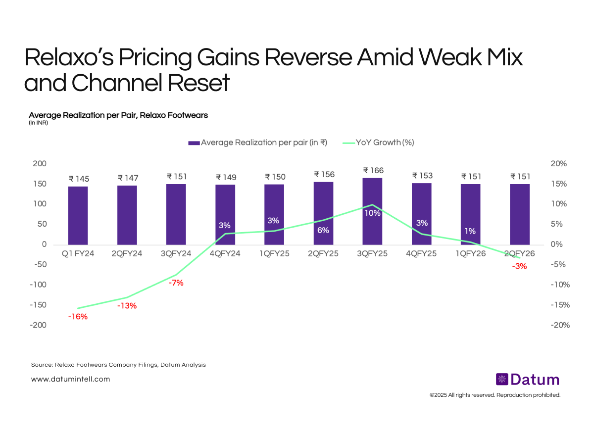 The flattening of average realisations signals that the pricing-led growth cycle has ended, and Relaxo will now rely more on volume recovery to drive topline momentum. GST-related disruptions and a softer mix have weighed on realisation growth, but as the channel normalises and distribution expansion picks up, pricing should stabilise. However, meaningful improvement will depend on a revival in mass-market demand, stronger traction in mid-priced and premium segments, and continued cost discipline to protect margins.