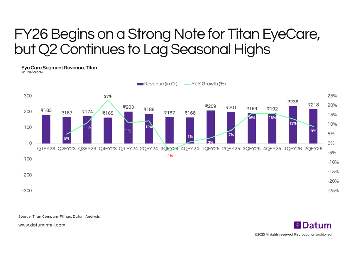 Titan’s EyeCare segment shows a clear recovery trajectory after the soft performance in FY24. Revenues rose sharply in Q1 FY26 to ₹236 crore (13% YoY), marking the strongest first-quarter performance in the last four years. However, Q2 FY26 revenue moderated to ₹218 crore (9% YoY), reflecting a recurring pattern where Q2 underperforms relative to Q1 and the festive-led Q3. Historical data shows Q2 is consistently slower due to lower discretionary spending, fewer store upgrades, and absence of promotional triggers.